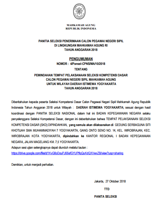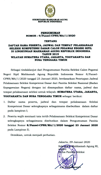 Pengumuman lowongan cpns ma mahkamah agung tahun 2018. Melalui situs resmi ma peserta skd dengan keterangan p l merupakan peserta yang memenuhi nilai ambang batas menurut peraturan menteri pendayagunaan aparatur negara dan reformasi birokrasi permenpan rb nomor 24 tahun 2019. Jakarta humas senin 11 november 2019.