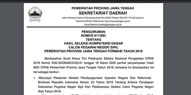 Pengumuman Hasil Akhir Seleksi Cpns Provinsi Kabupaten Kota Kementerian Formasi 2019 Tahun 2020 Pemprov Jateng Umumkan Hasil Sanggah Cpns 2019 156 Peserta Ganti Status