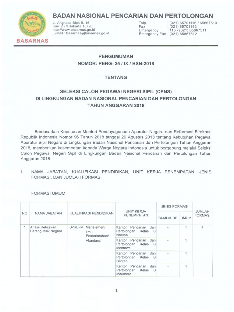 Pengumuman Lowongan Cpns Basarnas 2019 Tingkat Sma Smk D3 D4 S1