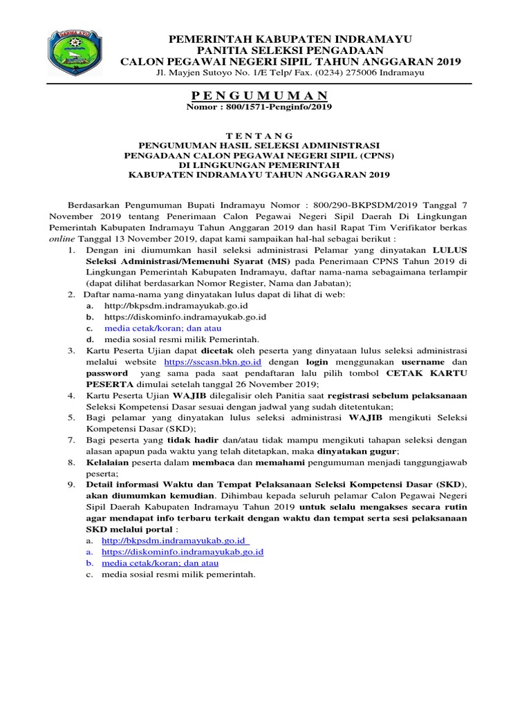 Pengumuman cpns kab indramayu 2019. Bahkan beberapa pengumuman penting dalam seleksi penerimaan cpns 2019 2020 kab indramayu juga admin bagikan. Berdasarkan pengumuman bupati indramayu nomor. Dapatkan informasi terbaru terkait hasil seleksi administrasi pendaftaran cpns kab indramayu tahun 2019.