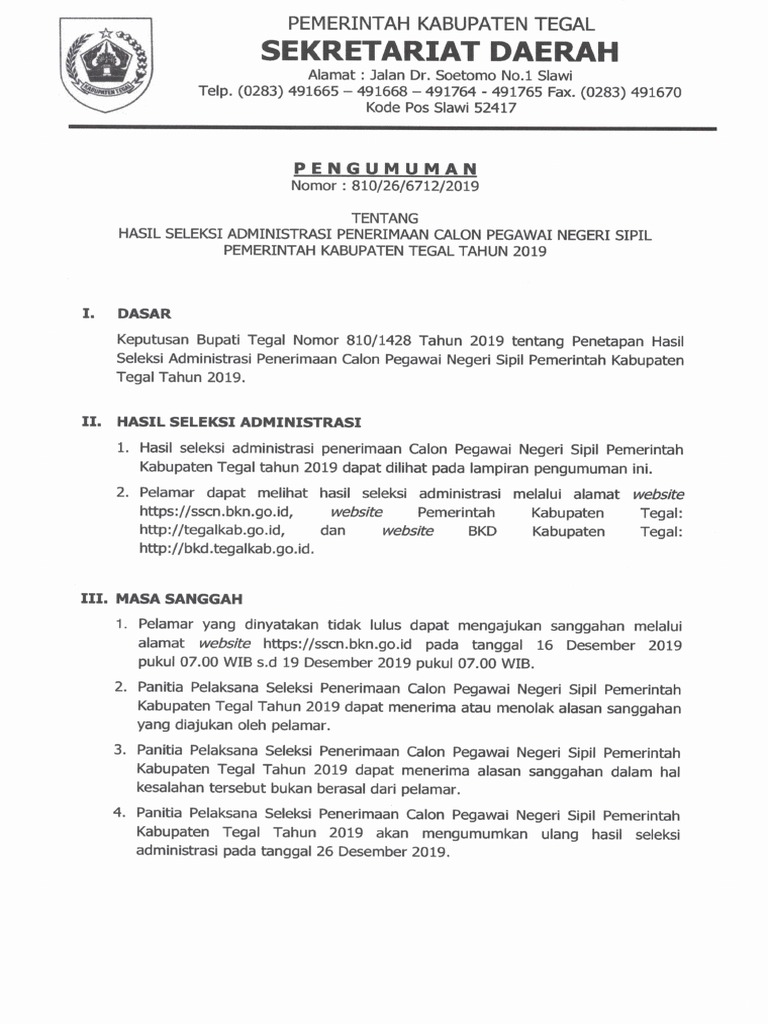 Hal ini dikarenakan pengumuman hasil seleksi administrasi telah diumumkan pada tanggal 16 desember 2019 yang lalu. 800 290 bkpsdm 2019 tanggal 7 november 2019 tentang penerimaan calon pegawai negeri sipil daerah di lingkungan pemerintah kabupaten indramayu tahun anggaran 2019 dan hasil rapat tim verifikator berkas online tanggal 13 november 2019 dapat kami sampaikan hal hal sebagai berikut. Seperti pada poin 1 bahwa pendaftaran cpns 2019 2020 kabupaten indramayu akan dimulai prosesnya akhir oktober.