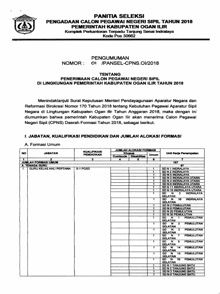 Pengumuman Penerimaan Cpns Kab Ogan Ilir Tahun 2018 Pdf