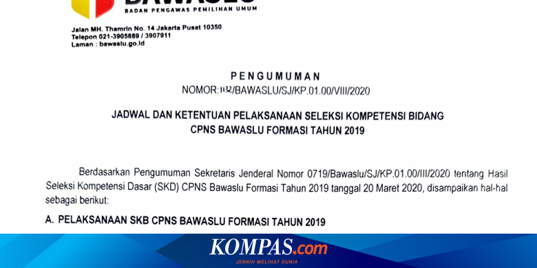 Jadwal Lengkap Dan Lokasi Tes Skb Cpns 2019 Bawaslu Halaman All Kompas Com