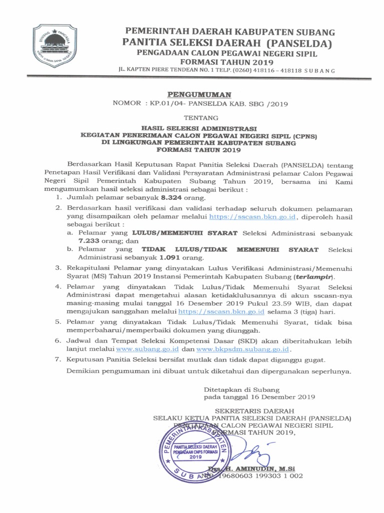Pengumuman Hasil Seleksi Administrasi Penerimaan Cpns Di Lingkungan Pemkab Subang Formasi Tahun 2019