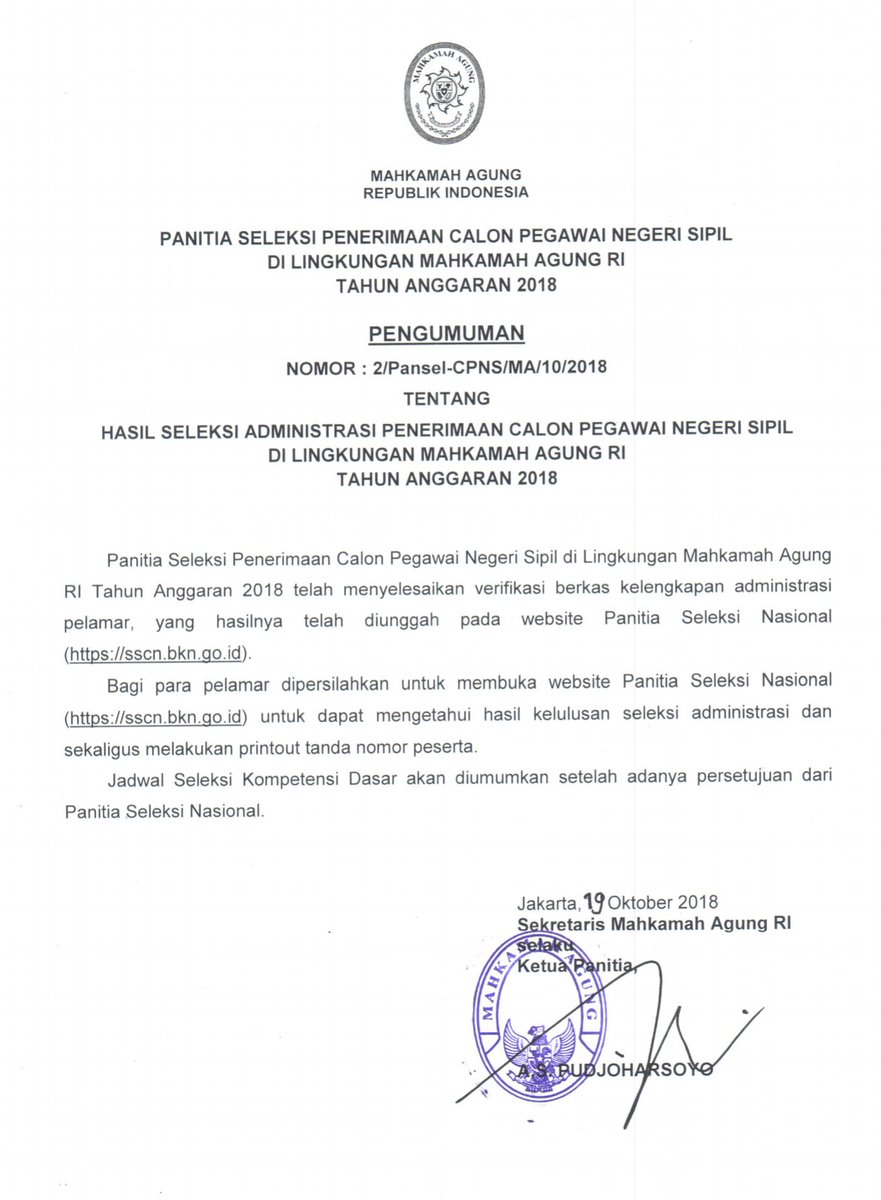 Pengumuman Hasil Seleksi Administrasi Cpns Mahkamah Agung 2018