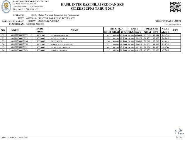 Pengumuman hasil seleksi administrasi cpns dapat di unduh disini pelaksanaan skd bagi pelamar unit kerja kantor pusat dan balai diklat lokasi ujian dki jakarta dapat di unduh disini pelaksanaan seleksi komptensi dasar skd bagi pelamar yang dinyatakan lulus seleksi administrator unit kerja penempatan kantor pencarian dan pertolongan di lingkungan badan nasional pencarian dan pertolongan. Pengumuman hasil seleksi administrasi cpns basarnas 2019 lulus verifikasi berkas.