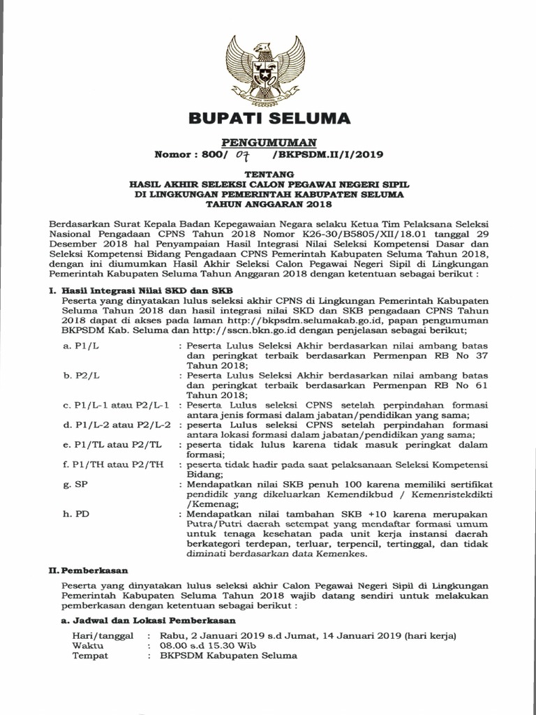 Pengumuman Hasil Skd Skb Cpns Kab Seluma 2019 2020